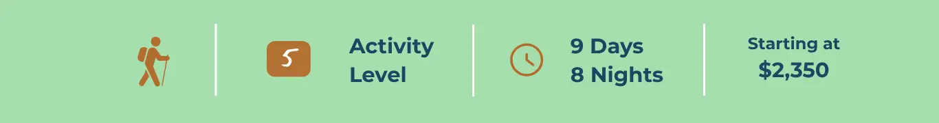 All of your belongings must fit in a backpack worn on your back. We indicate in the Activity Levels section if hiking will be done with a backpack or a daypack. No rolling suitcases or other types of luggage are allowed on this trip. We will provide a detailed packing list.
