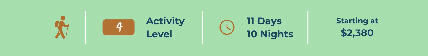 All of your belongings must fit in a backpack worn on your back. We indicate in the Activity Levels section if hiking will be done with a backpack or a daypack. No rolling suitcases or other types of luggage are allowed on this trip. We will provide a detailed packing list.
