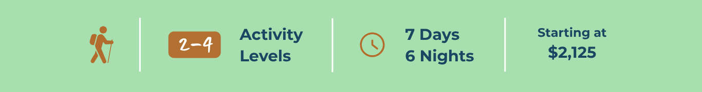 Must be comfortable with the activities and activity levels listed and have a sense of adventure. If under 18, must be accompanied by a chaperone and will likely need to purchase a lodging upgrade.